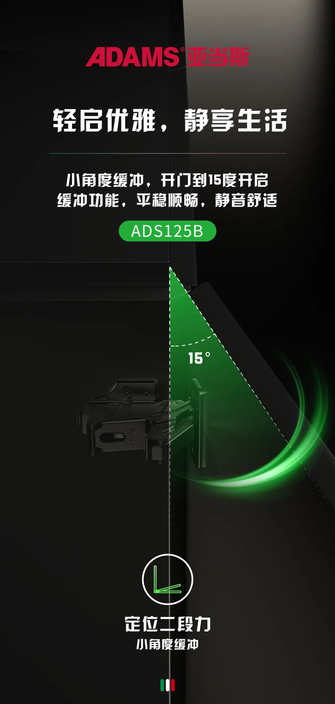 亞當(dāng)斯ADS125系列鉸鏈有小角度緩沖功能,當(dāng)柜門打開到15°時(shí),能啟動(dòng)二次帶緩沖,減少夾手的危險(xiǎn)系數(shù),降低了關(guān)門而產(chǎn)生噪音。