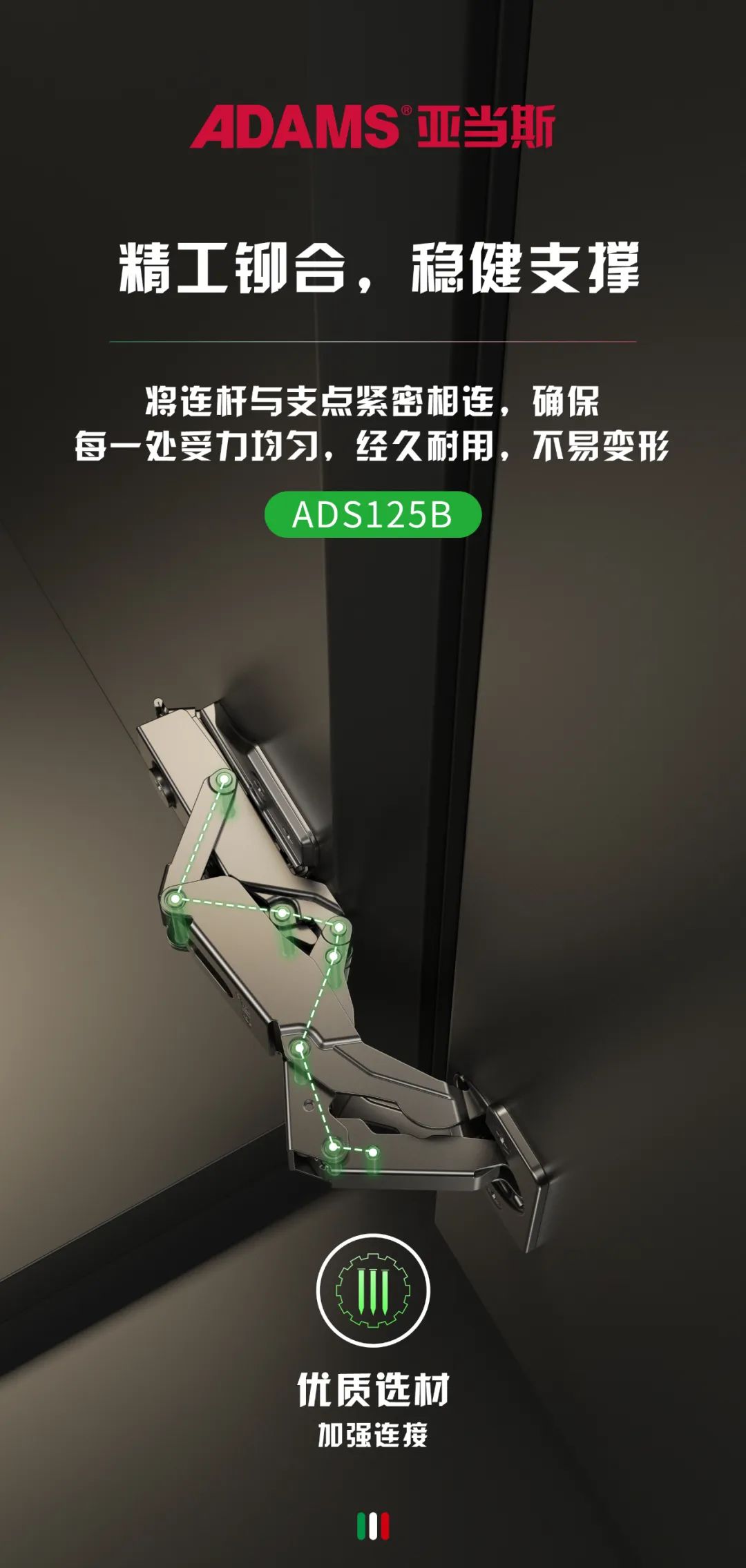亞當(dāng)斯ADS125系列鉸鏈具有任意定位功能,打開柜門到45°后,任意角度都能停下,不會(huì)出現(xiàn)門板大力撞向墻壁或柜邊物品的情況,為每個(gè)家庭帶來實(shí)實(shí)在在的安全感。
