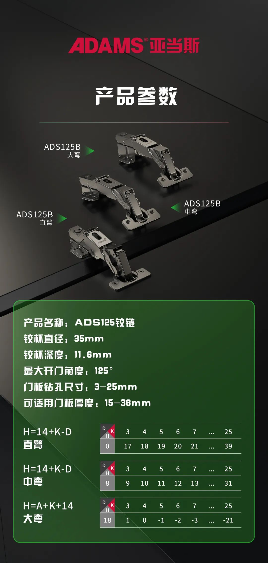 ADS125系列鉸鏈共有3款選擇,分別是:大彎、中彎、直臂。