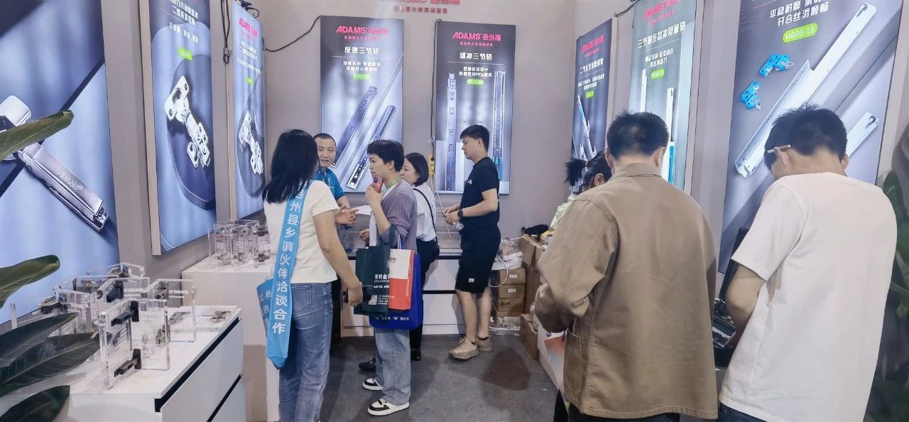 亞當斯的展位上陳列了各式各樣的鉸鏈、滑軌等明星產品,其中GM一字鉸鏈、GS18A鉸鏈、MD03三節隱藏滑軌等產品吸引眾多的觀眾咨詢和體驗,成為展位的焦點之一。不少專業觀眾表示:“亞當斯五金產品簡約時尚,性能卓越,能為家居生活添磚加瓦,提升了家居的實用性和美觀度。”