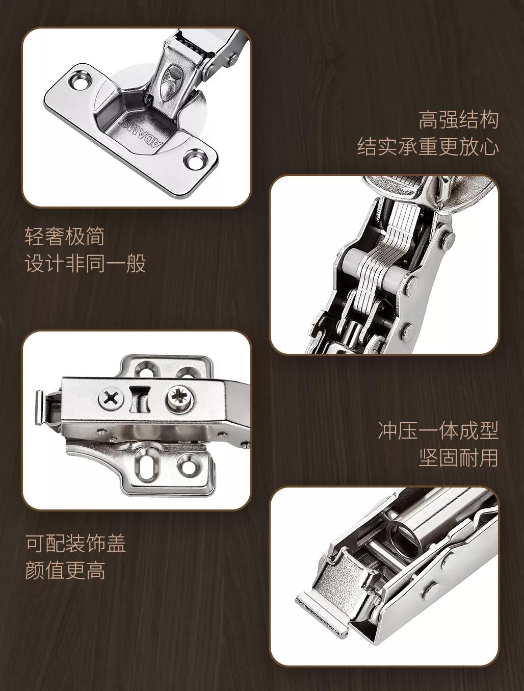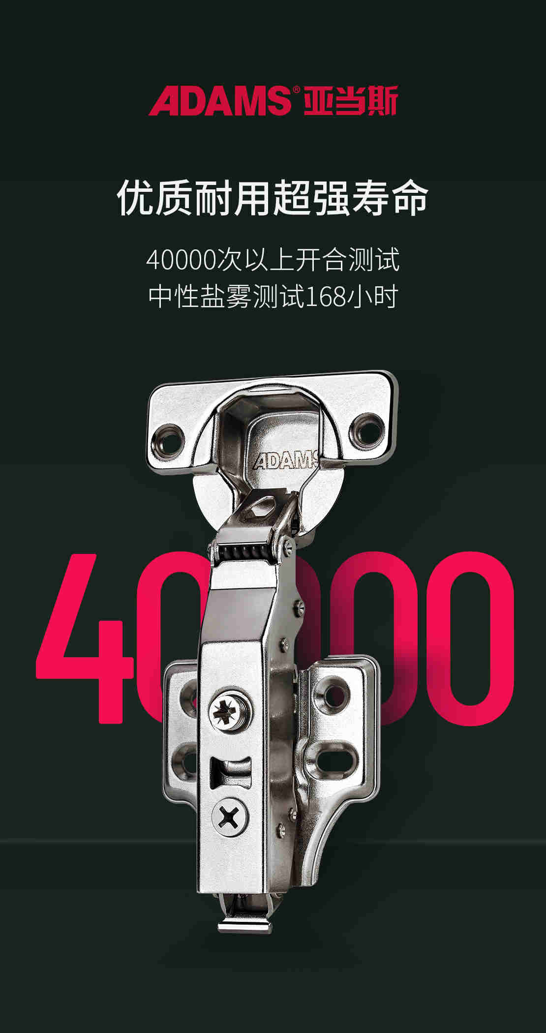 亞當斯變幻王各組成零件之間切合緊密,不易產生松動,鉸鏈表面經過中性鹽霧測試168小時,酸性測試24小時,開合壽命40000次,一開一關之間手感更輕巧。
