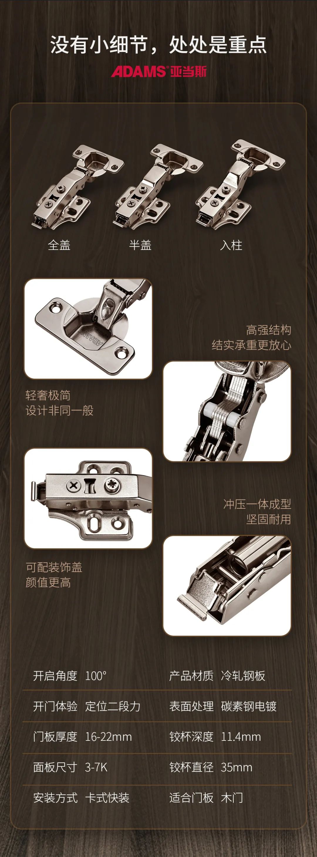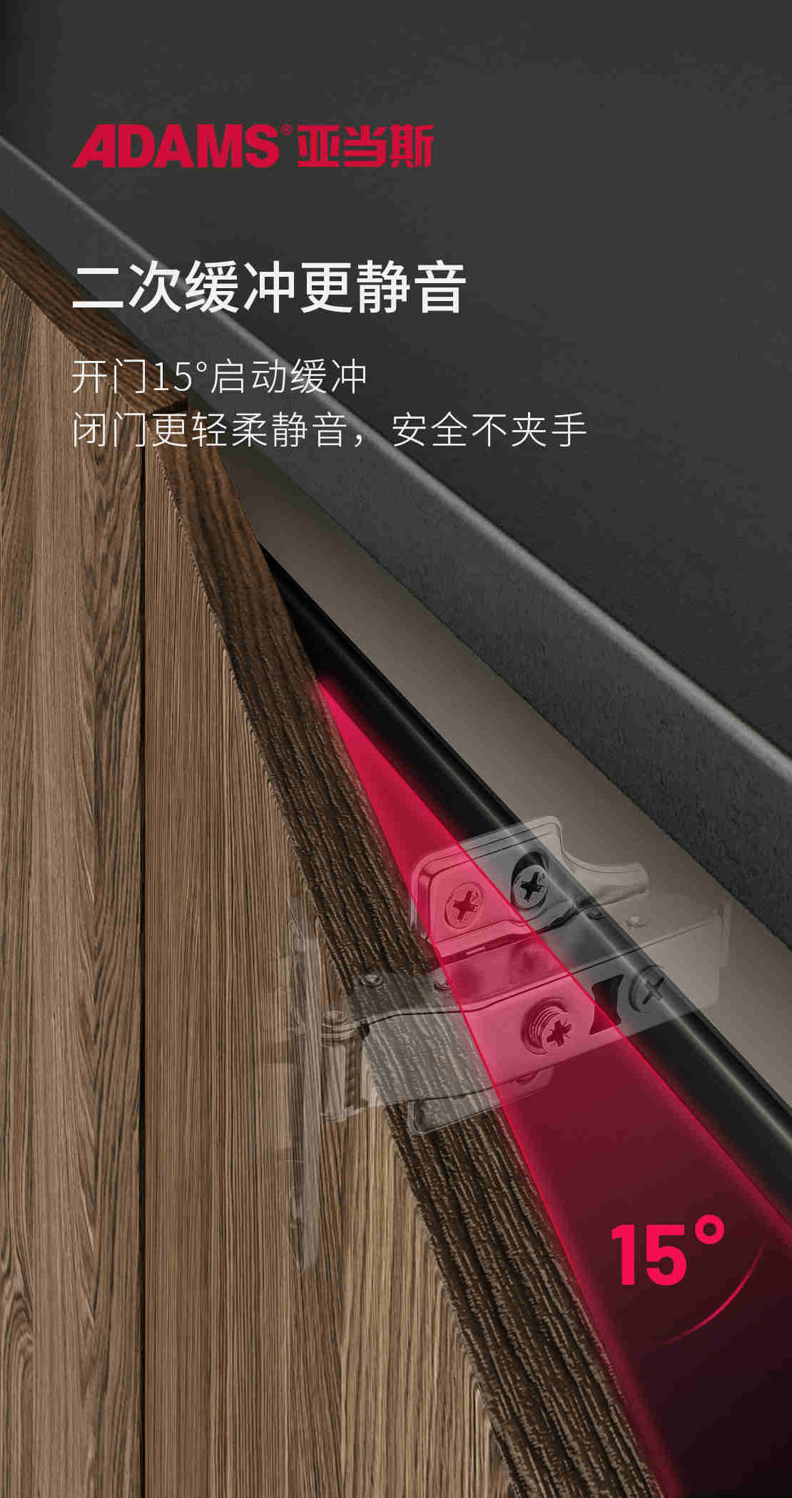 亞當斯變幻王在設計上更具人性化,開門85°隨意停下,15°小角度緩沖效果能有效防止“被門板夾手”的情況,同時能更好地保護門板。