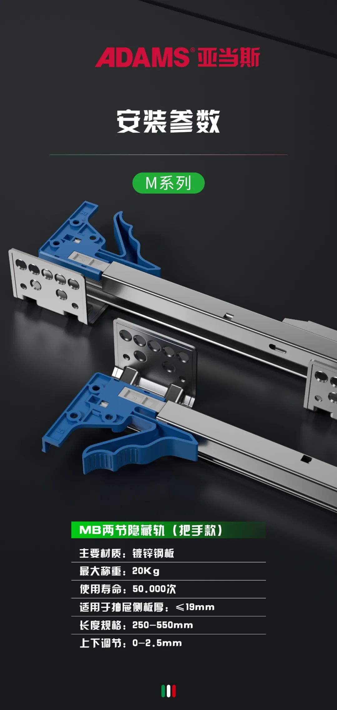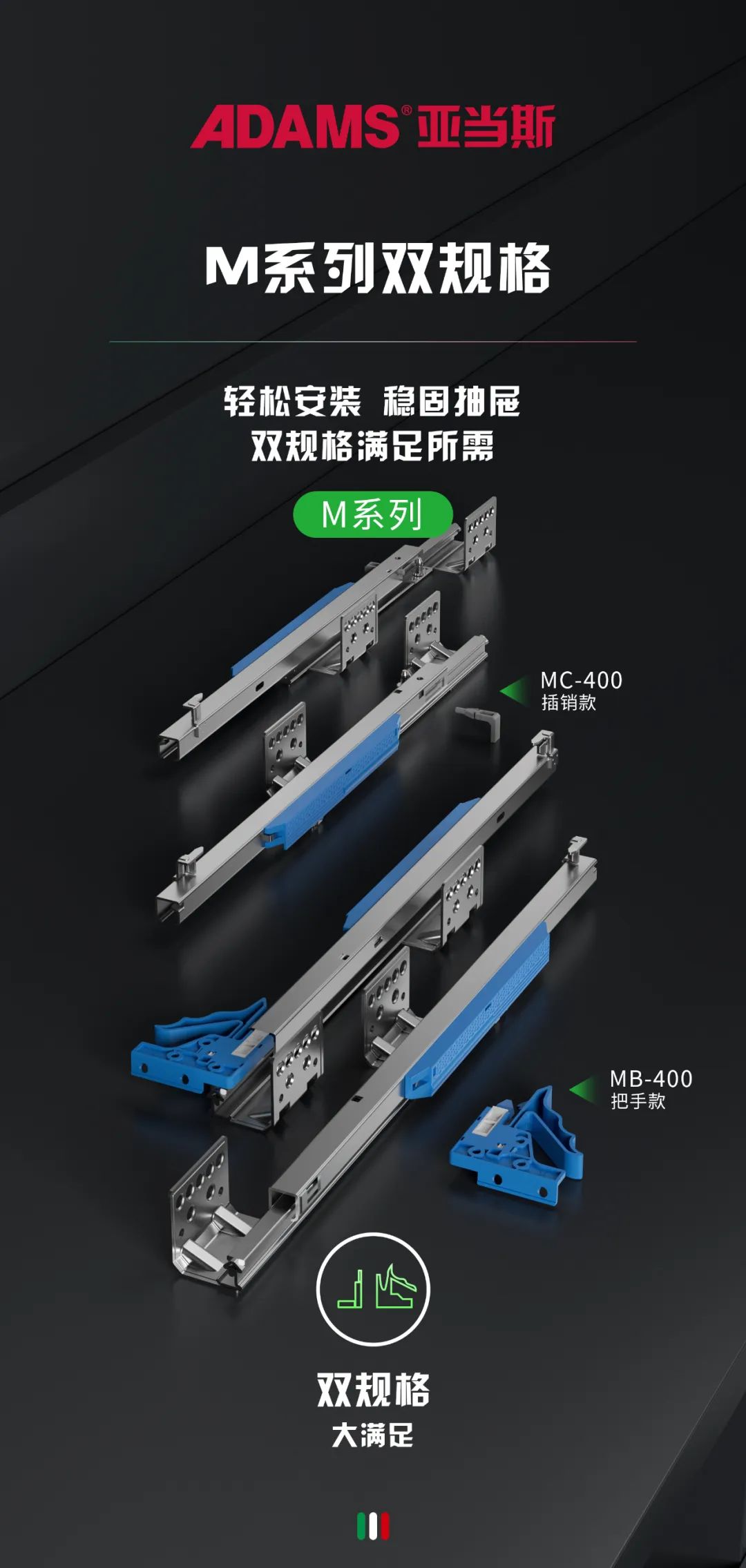 亞當(dāng)斯M系列二節(jié)隱藏滑軌分為:把手款和插銷款,根據(jù)家具安裝需求選擇最佳的抽屜搭檔即可,適配多種柜體,裝卸簡(jiǎn)單省時(shí)提效。