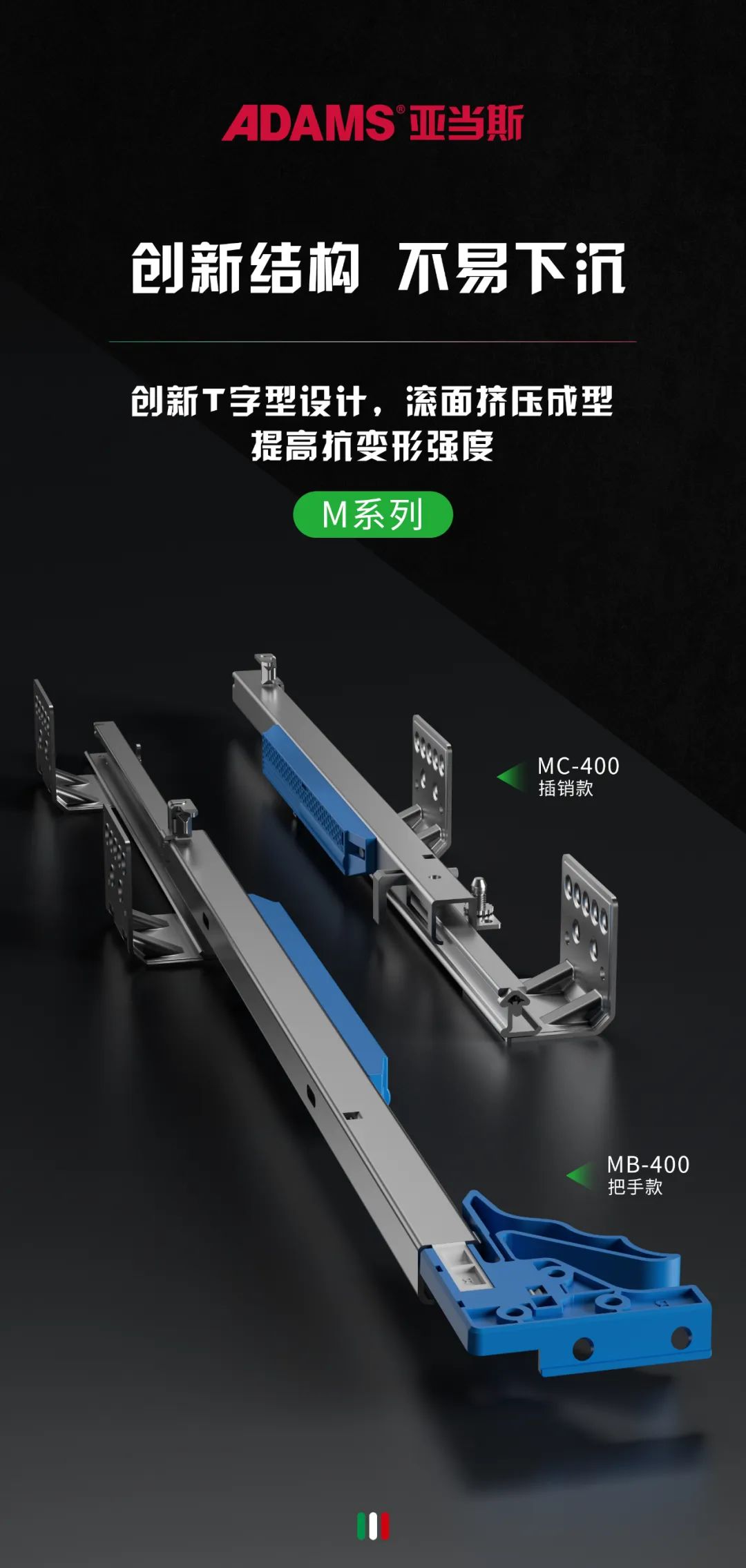 亞當(dāng)斯M系列二節(jié)隱藏滑軌采用創(chuàng)新T字型設(shè)計(jì)結(jié)構(gòu),滾面擠壓成型,軌道抗變形能力強(qiáng),即使在大重量下,滑軌運(yùn)動(dòng)絲滑順暢。