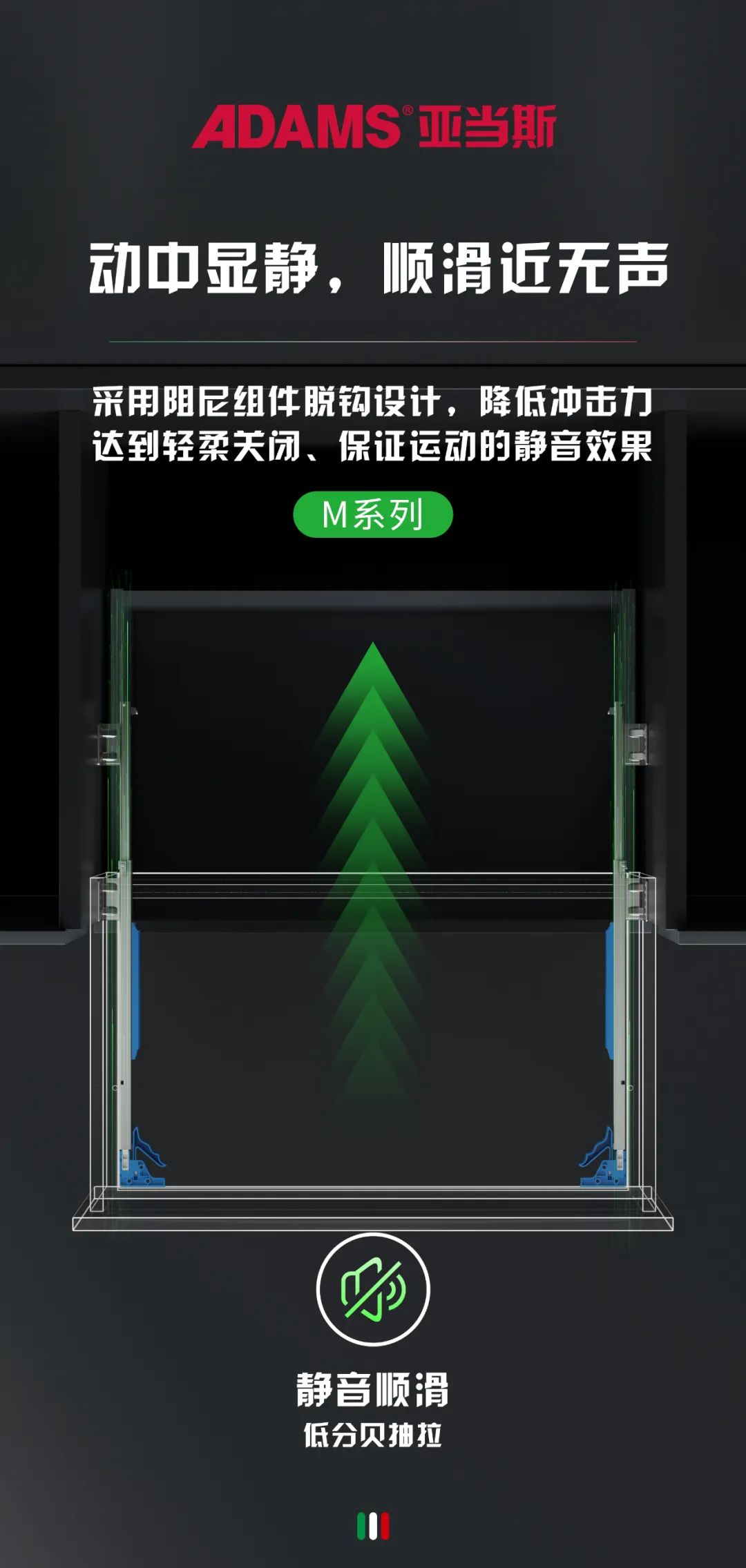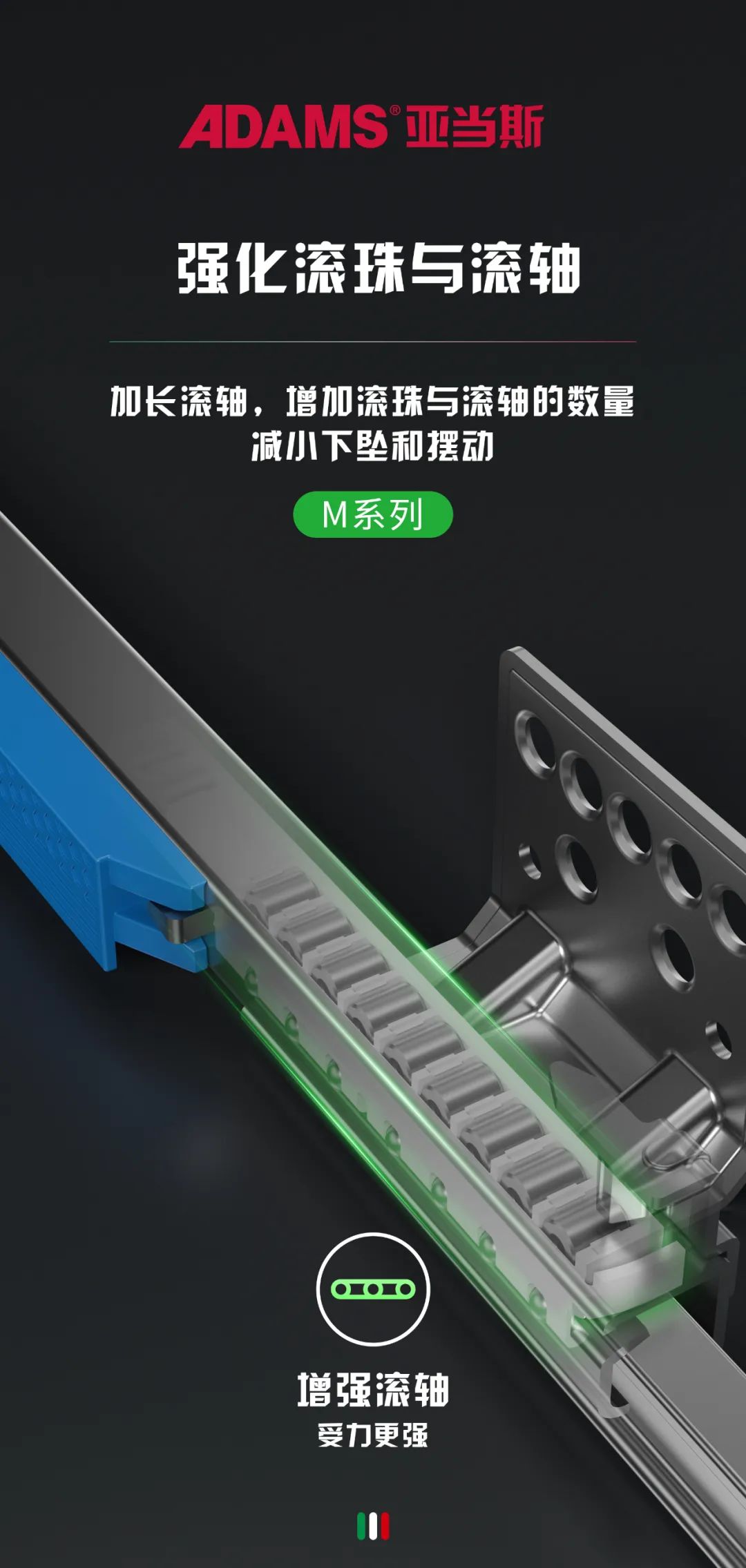 亞當(dāng)斯M系列二節(jié)隱藏滑軌采用高壓油缸、阻尼組件脫鉤設(shè)計(jì),運(yùn)動(dòng)過(guò)程緩沖卸力,防撞耐用兼平穩(wěn)、無(wú)懼卡頓。