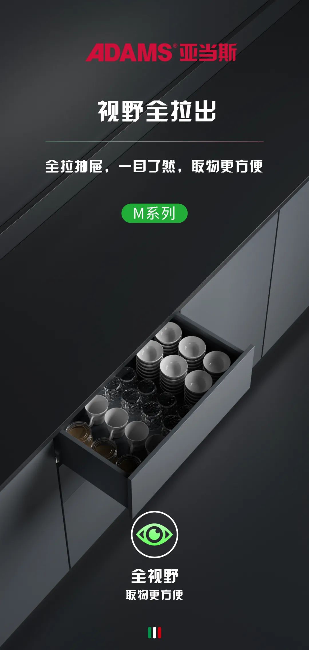 美好生活由此開(kāi)啟,負(fù)重推拉不費(fèi)力,亞當(dāng)斯M系列二節(jié)隱藏軌能承重達(dá)20kg,平穩(wěn)堅(jiān)固。