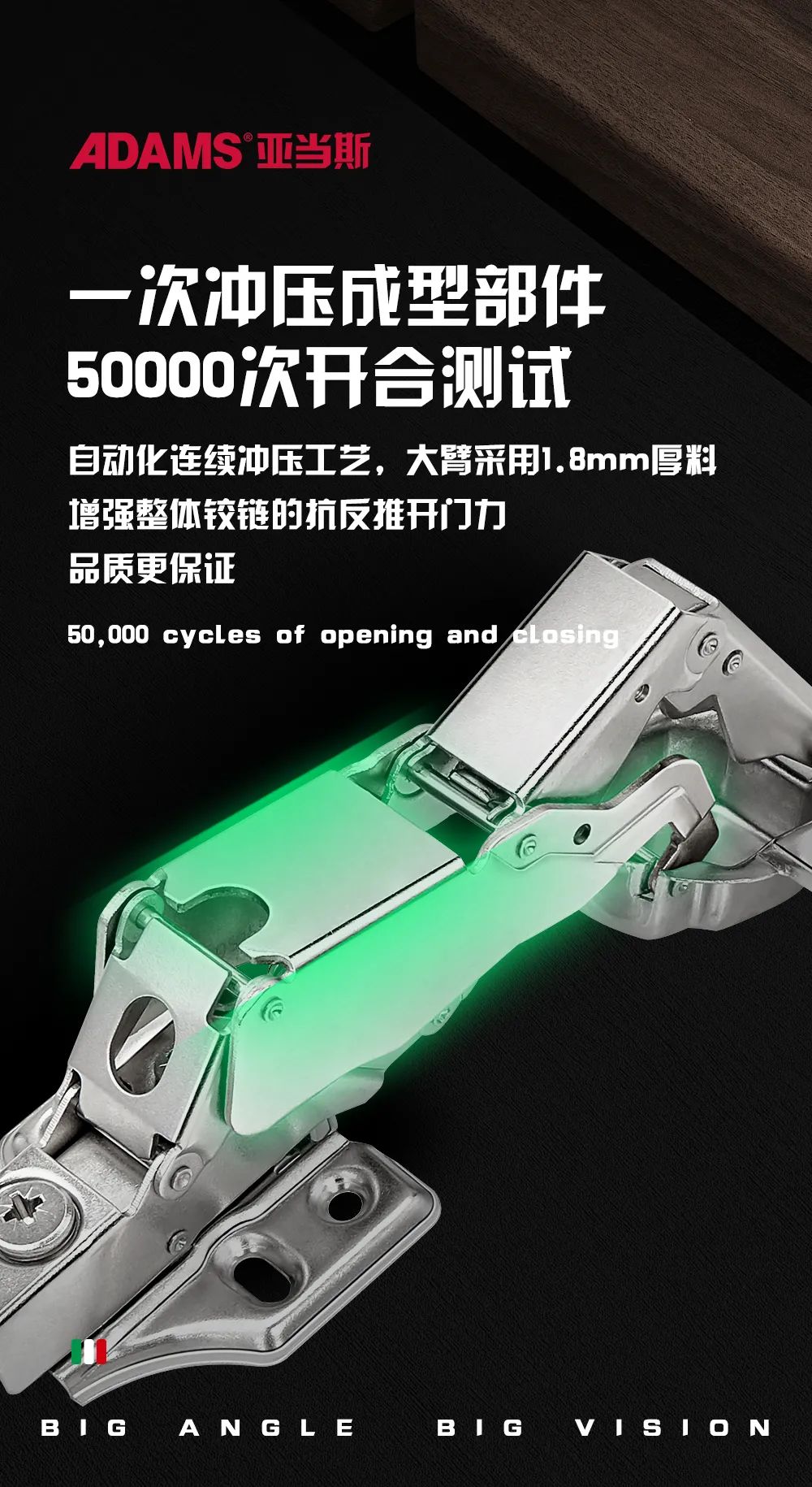 ADS165°大角度鉸鏈采用自動(dòng)化連續(xù)沖壓工藝,鉸鏈部件一次沖壓成型,柜門(mén)開(kāi)合次數(shù)達(dá)到5萬(wàn)次,增強(qiáng)整體鉸鏈的抗反推開(kāi)門(mén)力,外表潤(rùn)滑、手感扎實(shí)。