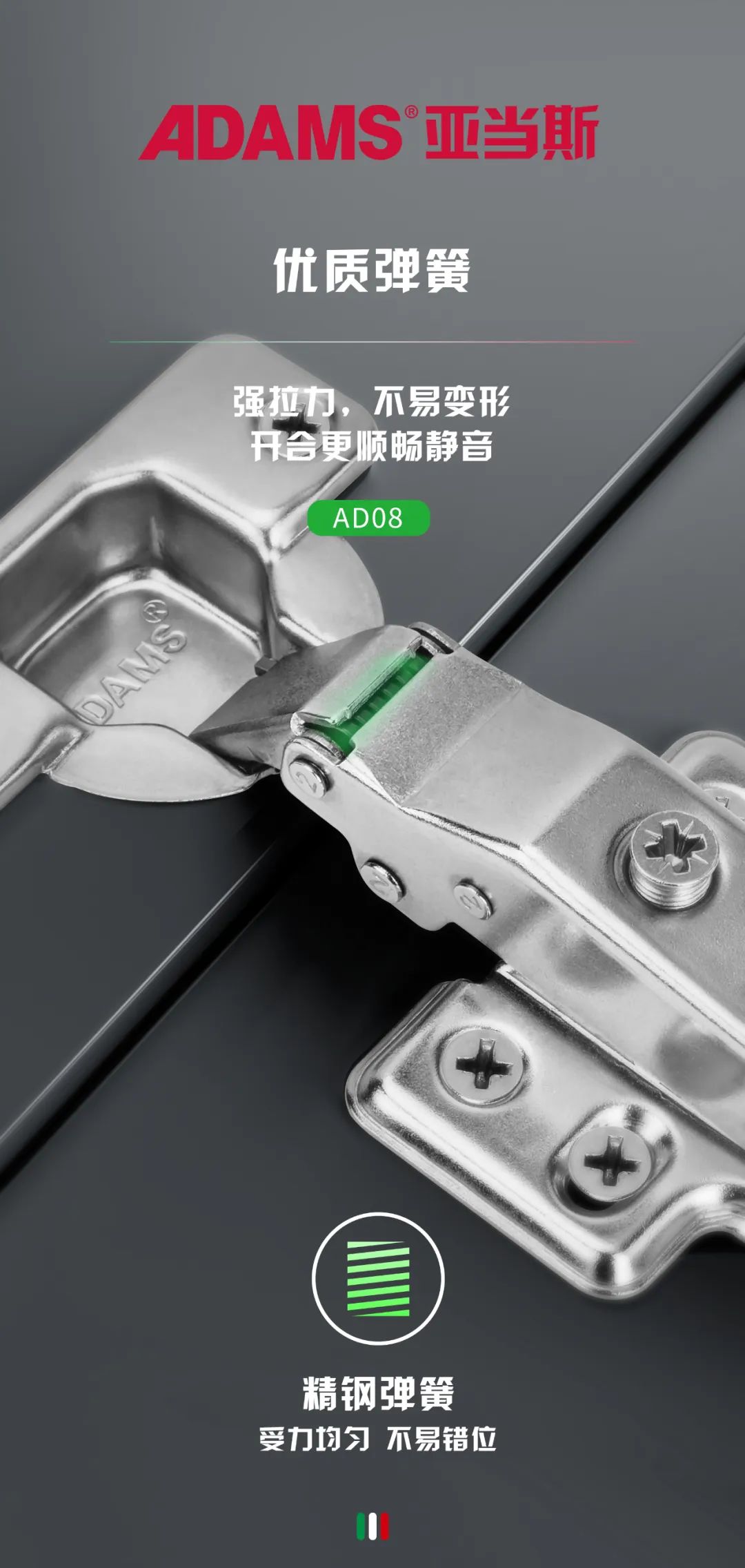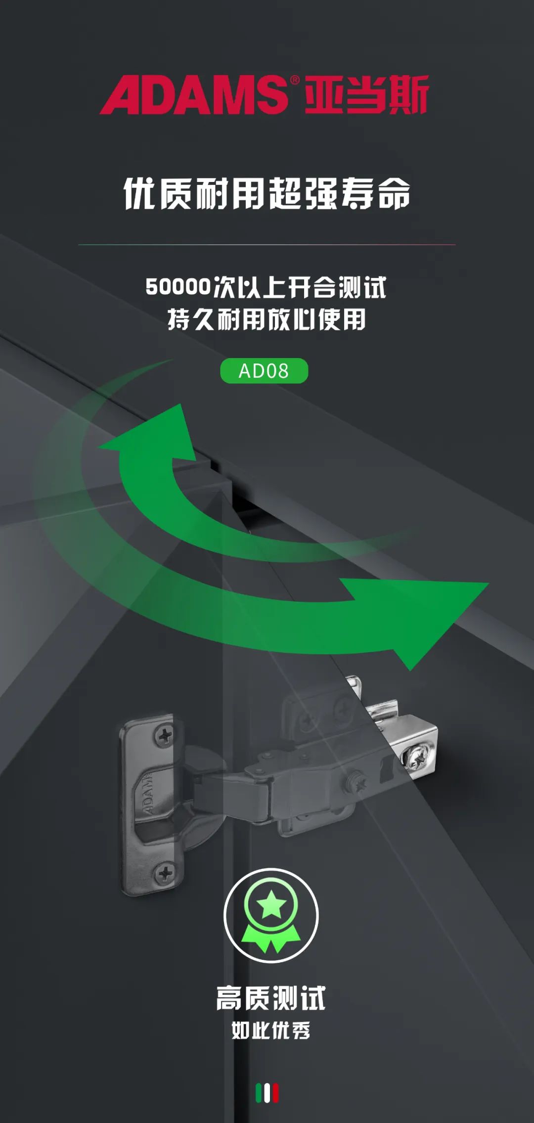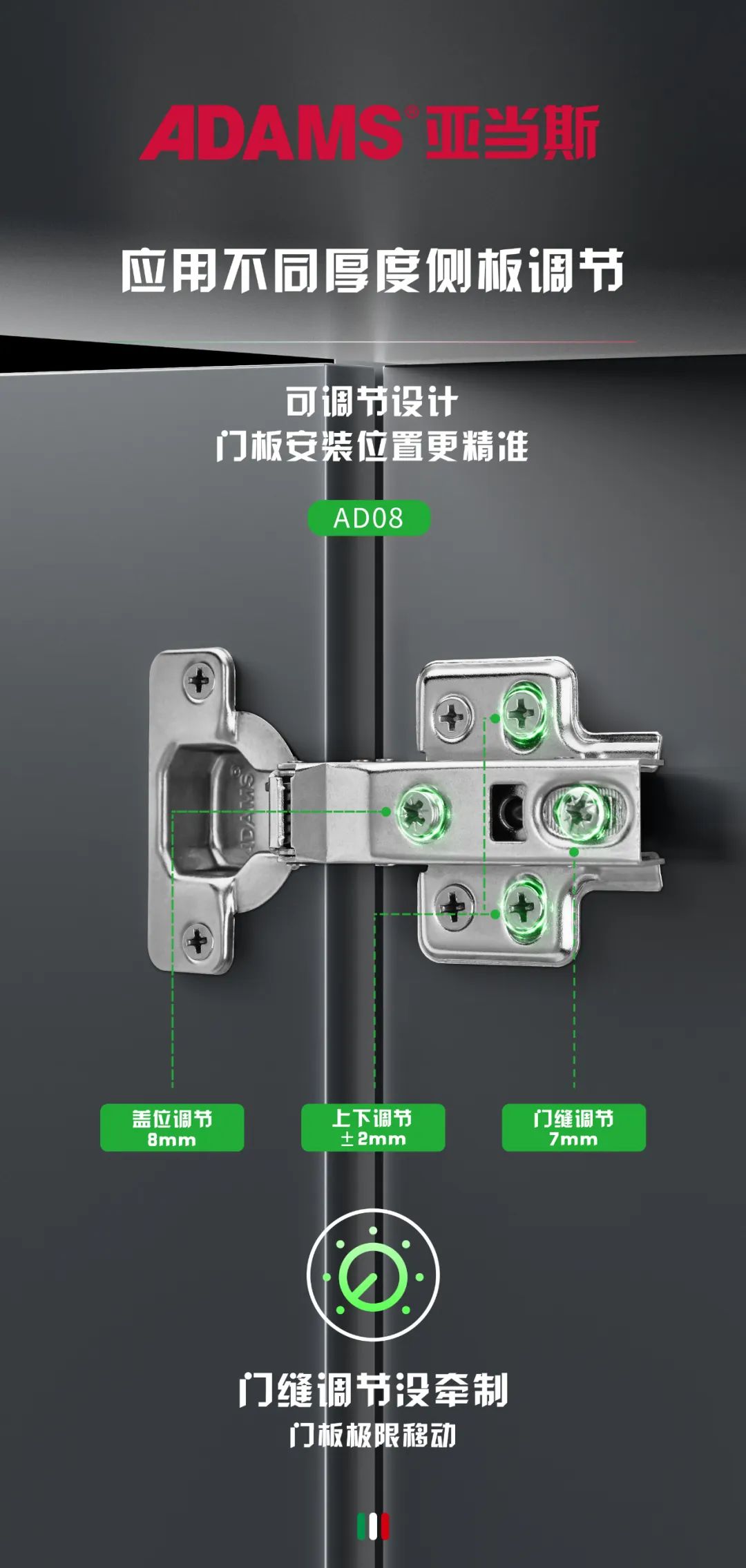 In order to achieve installation results, the AD08 series hinge can adjust the number of cover doors required for different thicknesses of side panels to the desired optimal value through adjusting screws on the hinge arm. The hinge can be adjusted by 7mm in a smaller direction based on the maximum number of covers, ensuring the adjustment required by the installation master during the installation process.