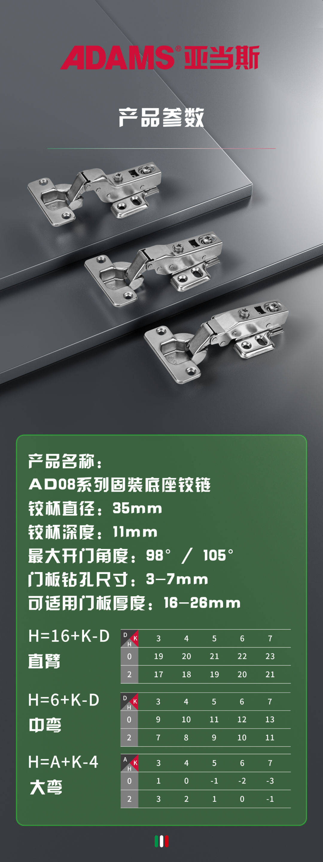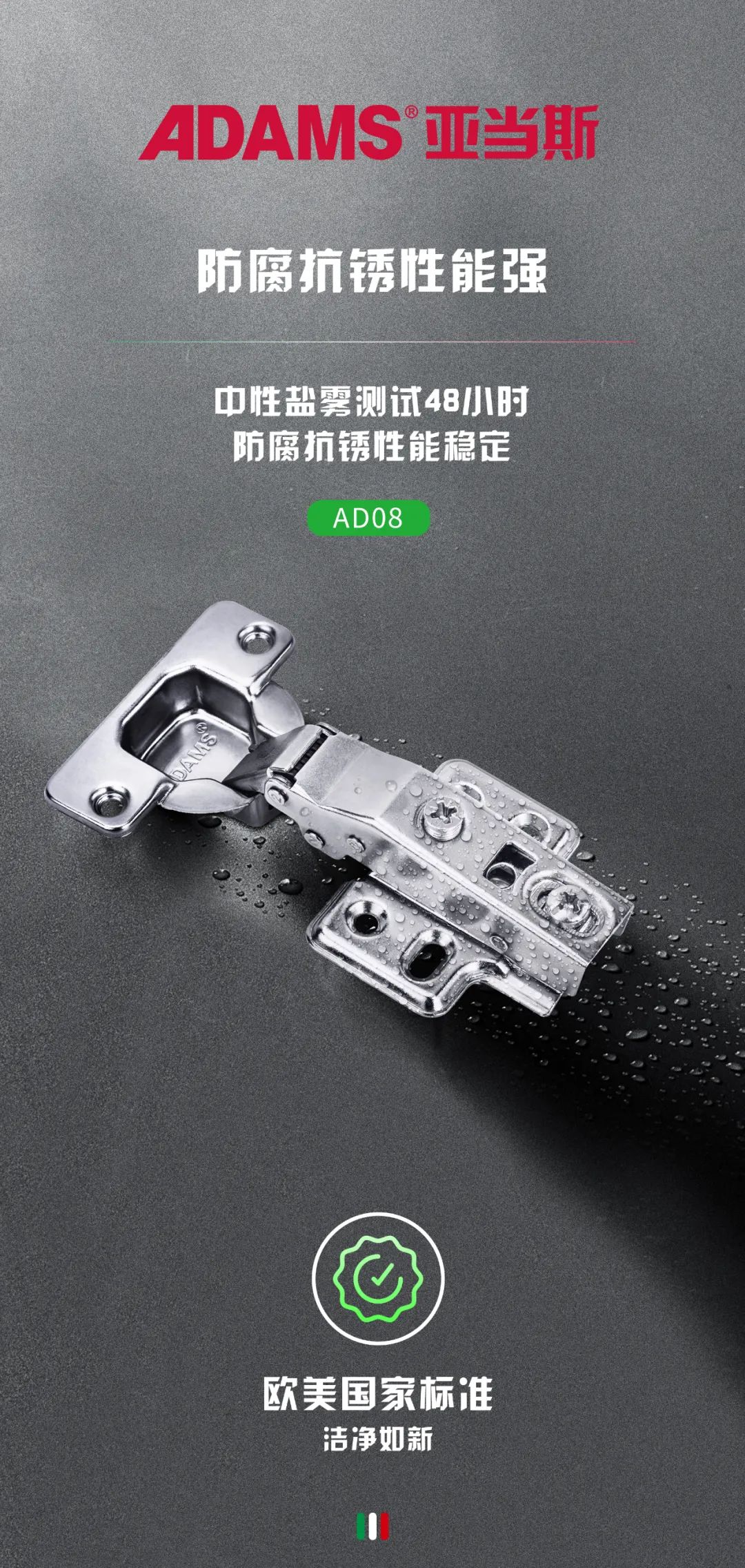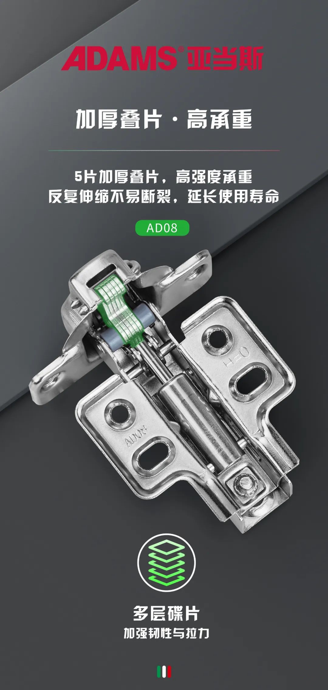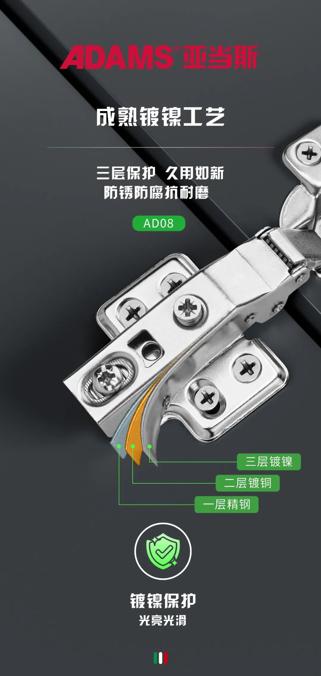 In order to achieve installation results, the AD08 series hinge can adjust the number of cover doors required for different thicknesses of side panels to the desired optimal value through adjusting screws on the hinge arm. The hinge can be adjusted by 7mm in a smaller direction based on the maximum number of covers, ensuring the adjustment required by the installation master during the installation process.
